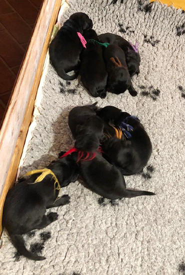 7. April 2022 | Peggy vom Dorfbach und Blacktoft Fire N'Ice sind am 7.4.2022 Eltern von 8 Welpen geworden. Das sind 6 Rüden und 2 Hündinnen, alle schwarz. Mehr zu der Verpaarung siehe Aktueller Wurf ![]() | ||