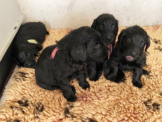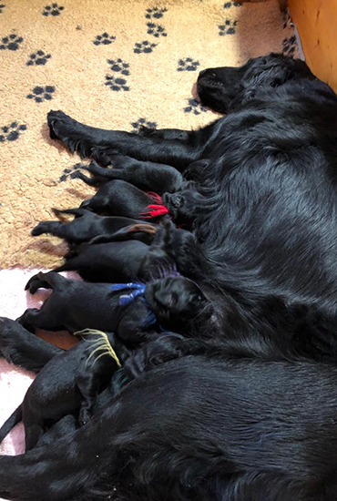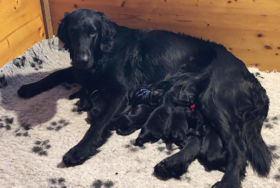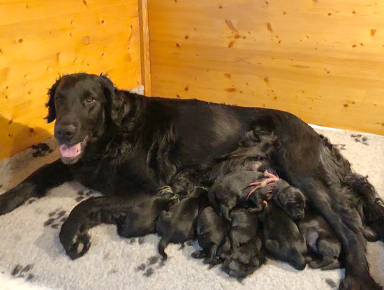 Wir freuen uns Ihnen mitzuteilen, dass Juma vom Dorfbach x Blacktoft Fire N'Ice am 2. Dezember 2019 Eltern von 5 Rüden und 4 Hündinnen, alle schwarz, geworden sind. Juma ist eine erfahrene, geübte und liebevolle Mutter. Wir freuen uns sehr, dass Juma diesen Wurf darf aufziehen. Interessenten, welche gerne einen Flatwelpen adoptieren möchten, melden sich bitte bei uns. Walter und Ursula Moser, Dorfstrasse 16, 3510 Freimettigen, Tel. 031 791 25 32. ![]() | ||